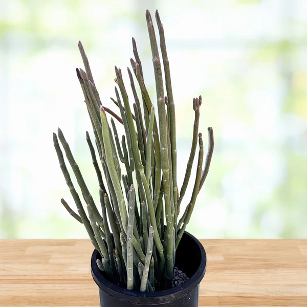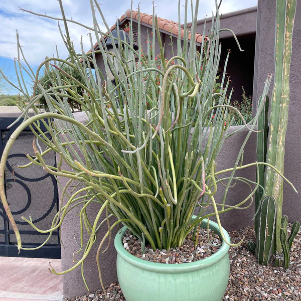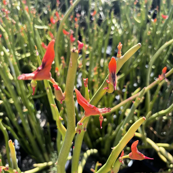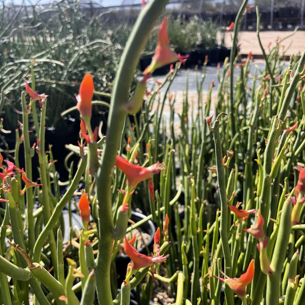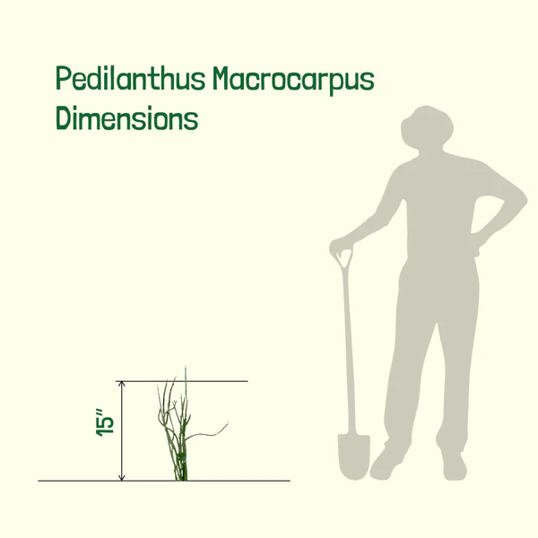 Pedilanthus macrocarpus ist eine architektonisch beeindruckende, sukkulente Pflanze aus der Sonora-Wüste. Mit ihren glatten, aufrechten, bläulich-grünen Trieben und orange-roten Blüten ist sie ein eleganter Blickfang in modernen Gärten, Steingärten oder Pflanzgefäßen. Sie liebt volle Sonne, trockene Bedingungen und gut drainiertes Substrat. Im Sommer gedeiht sie im Freien, im Winter wird sie hell und frostfrei überwintert. Pflegeleicht, strukturiert und exotisch – ideal für minimalistische Pflanzkonzepte.